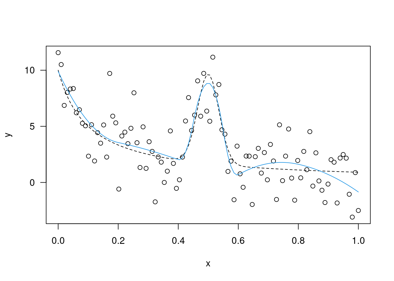 plot(xi,y,las=1,xlab="x"); lines(xi,mx,lty=2)