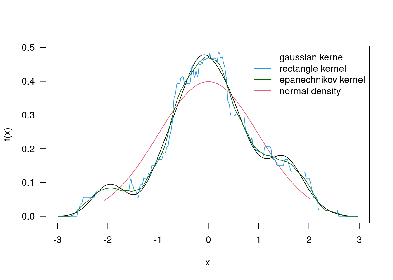 "epanechnikov kernel","normal density"), col=c(1,4,"darkgreen",2),